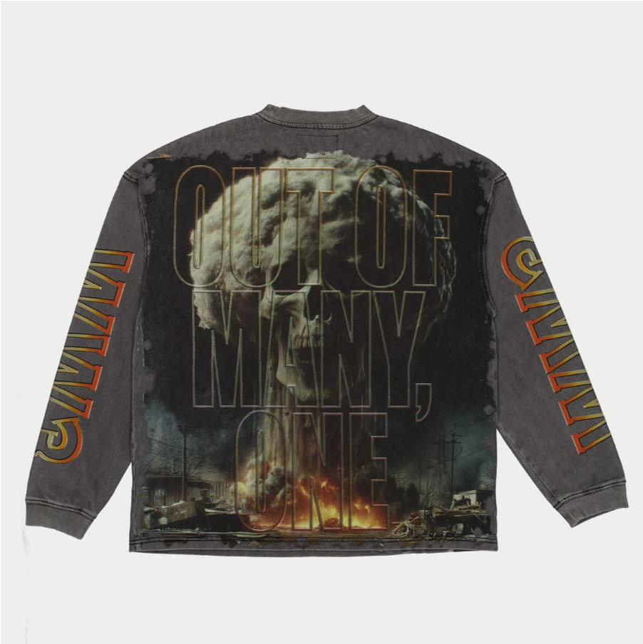 This long sleeve is crafted from 10oz mid-weight washed fabric and features a striking digital art piece.