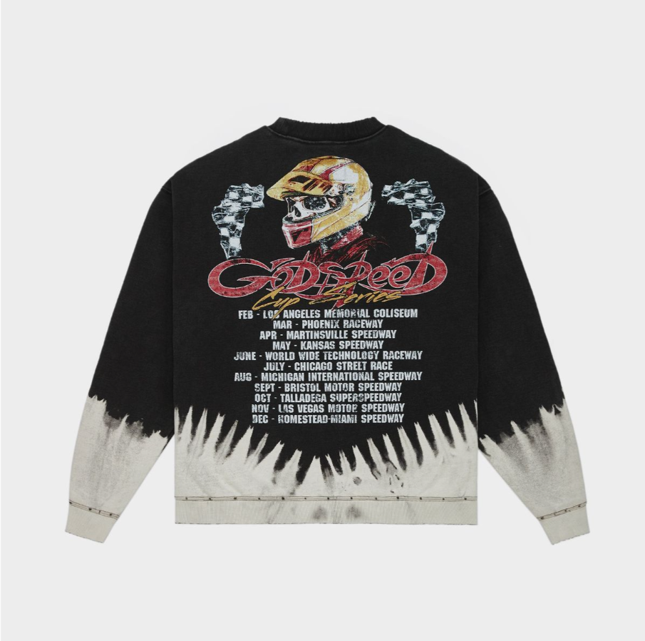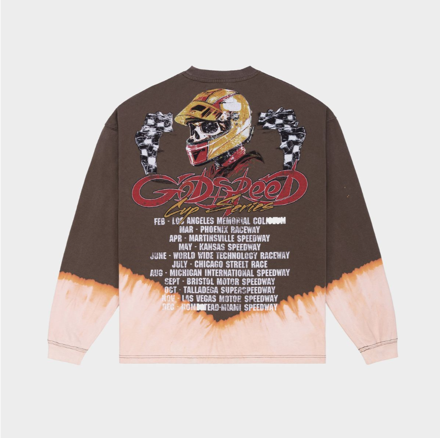 This long-sleeve shirt is made from 12oz mid-weight, washed fabric and features a captivating art piece with a distinctive wash fade towards the bottom.