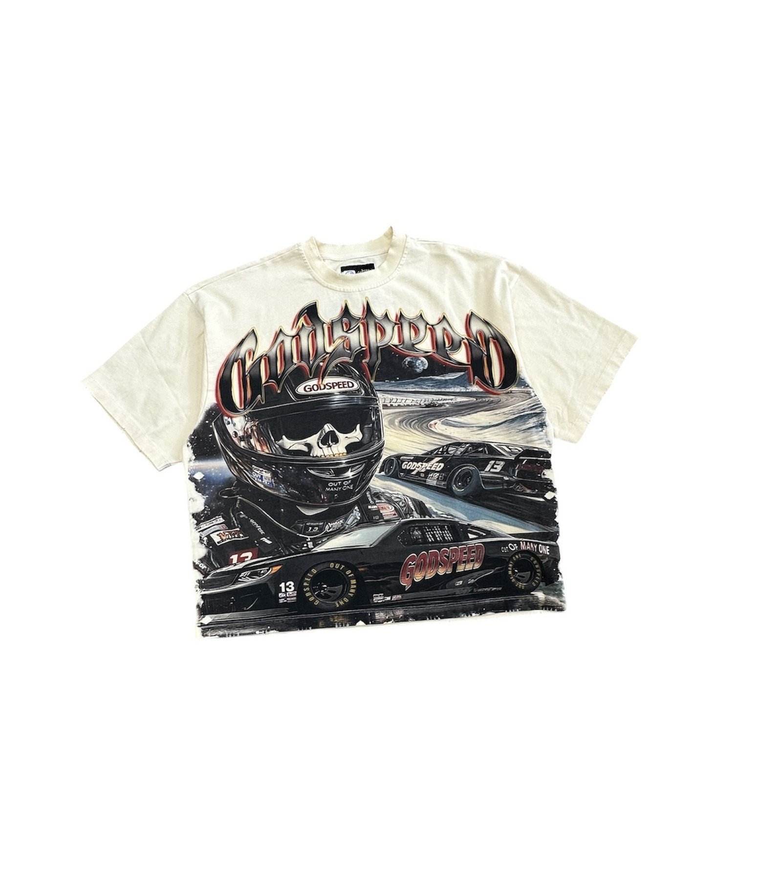 Rev up your fit with this high-octane drop straight from the speedway of the future. Featuring a skull-faced racer locked in at 200MPH, this tee screams danger, dominance and drive. Blacked-out muscle cars and thunder-track graphics explode off the faded base, while the bold GODSPEED logo fuels the chaos with rebellious energy.