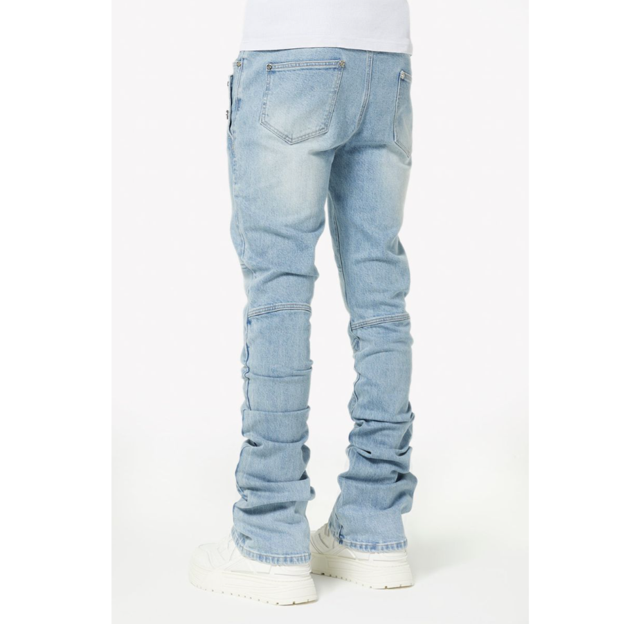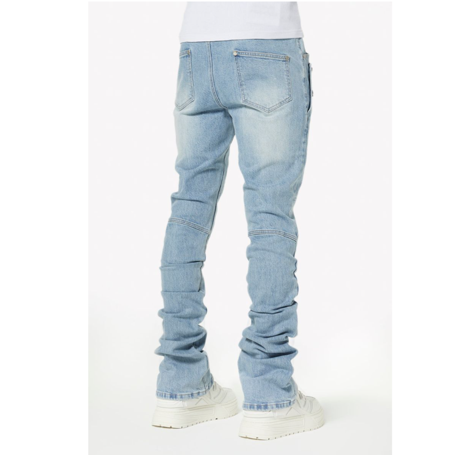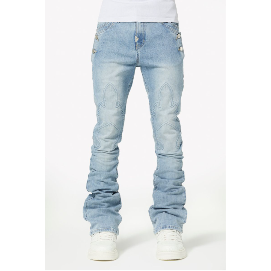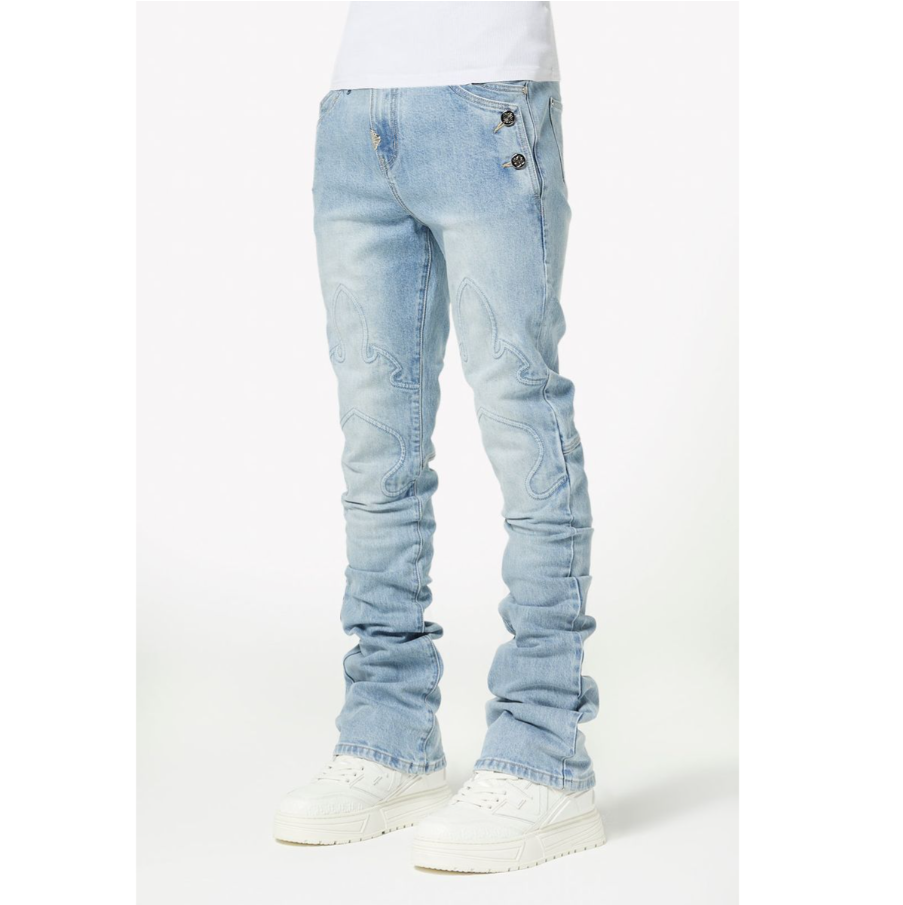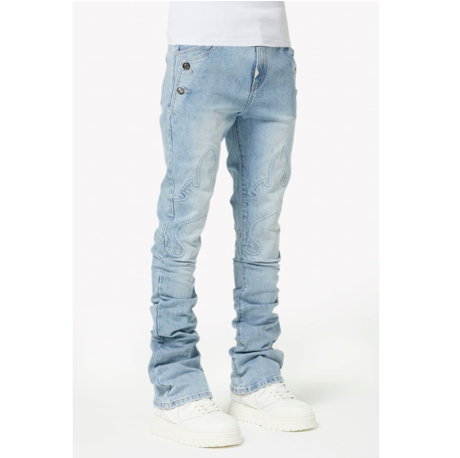 The Aqua Blue Sanctum Denim elevates contemporary streetwear with a clean yet distinctive design. Crafted in a refreshing light aqua blue wash, these jeans balance everyday versatility with bold, artistic details. The denim is finished with GUAPI’s signature stacked silhouette and carefully placed embroidered motifs, giving a structured yet fluid edge to the piece.