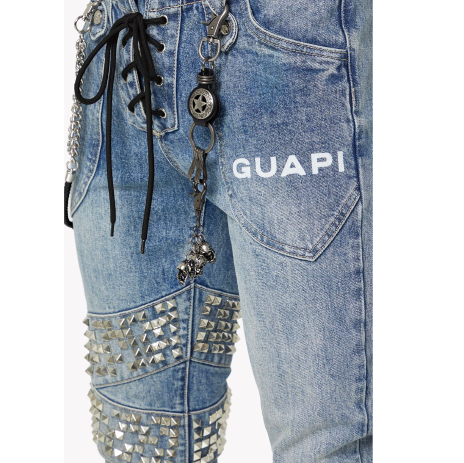 Industrial-inspired stud panels dominate both thighs and knees, arranged in a grid-like structure with varying spike lengths and placements for a multi-textured, armored effect. Black leather cords lace through grommets at the fly, complemented by layered keychains and a dual-toned chain accessory. The look is finished with the iconic GUAPI logo embroidery at the right pocket and a reinforced panel construction for added structure.