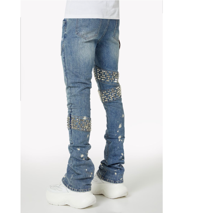 The Aqua Blue Warpath Denim is GUAPI’s battle-ready take on classic indigo jeans — engineered with rebellious precision and brutalist detail. This stacked skinny fit silhouette comes in a washed aqua-blue base, featuring intentional fading, distressing, and crackled paint splatters that lend a rugged, worn-in attitude.