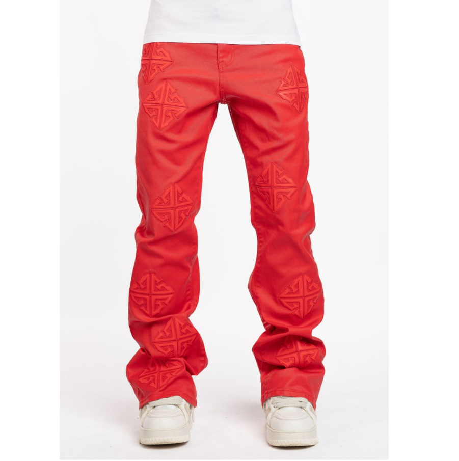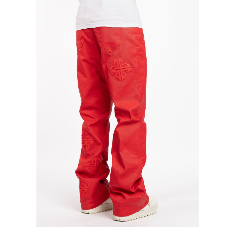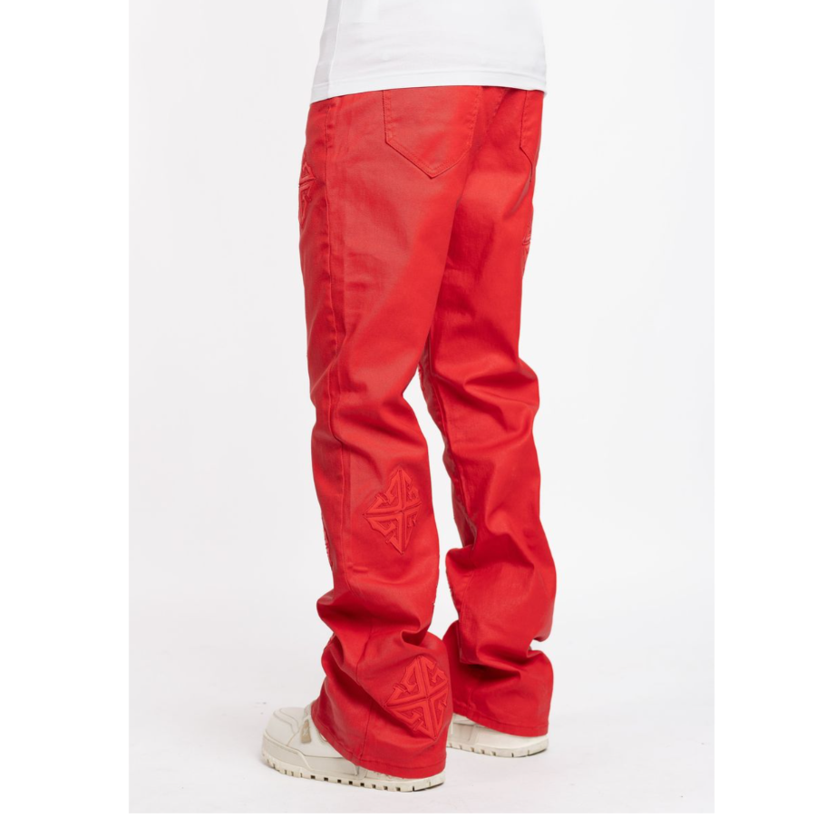 Side pockets and back pockets. Tapered fit.