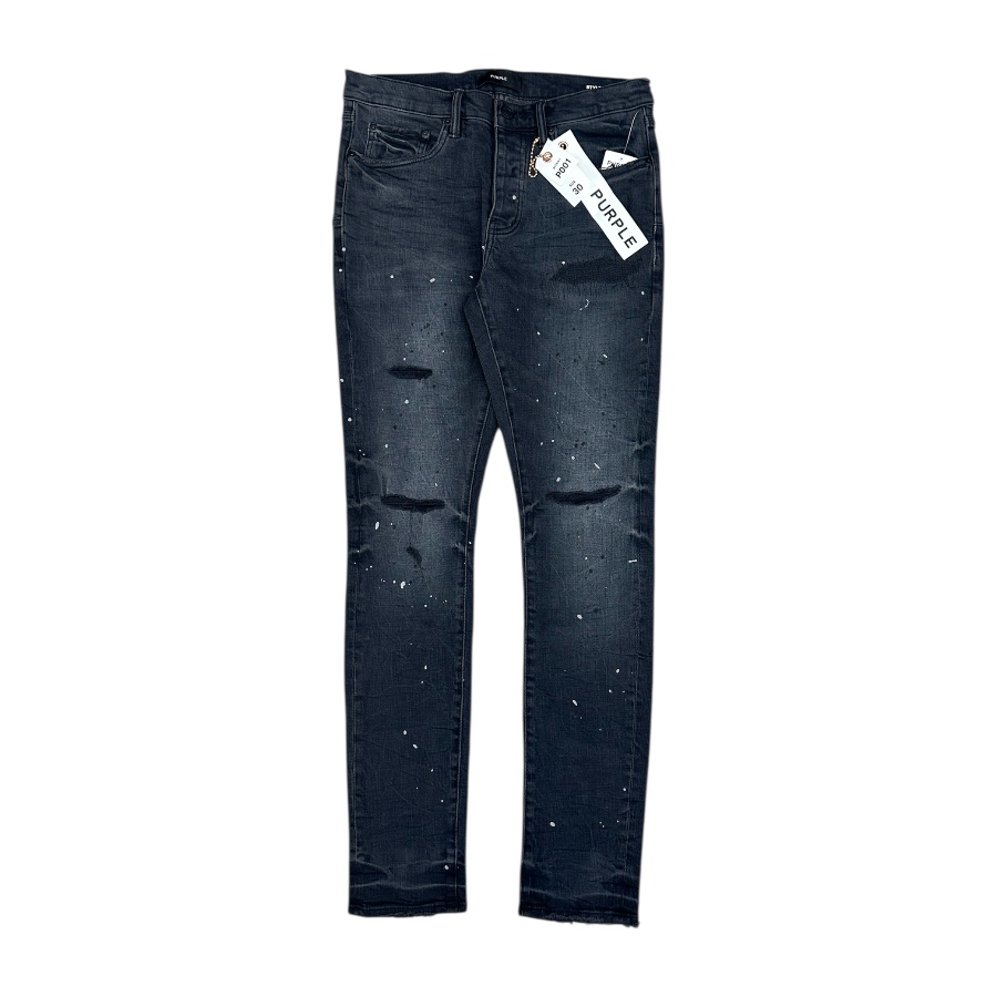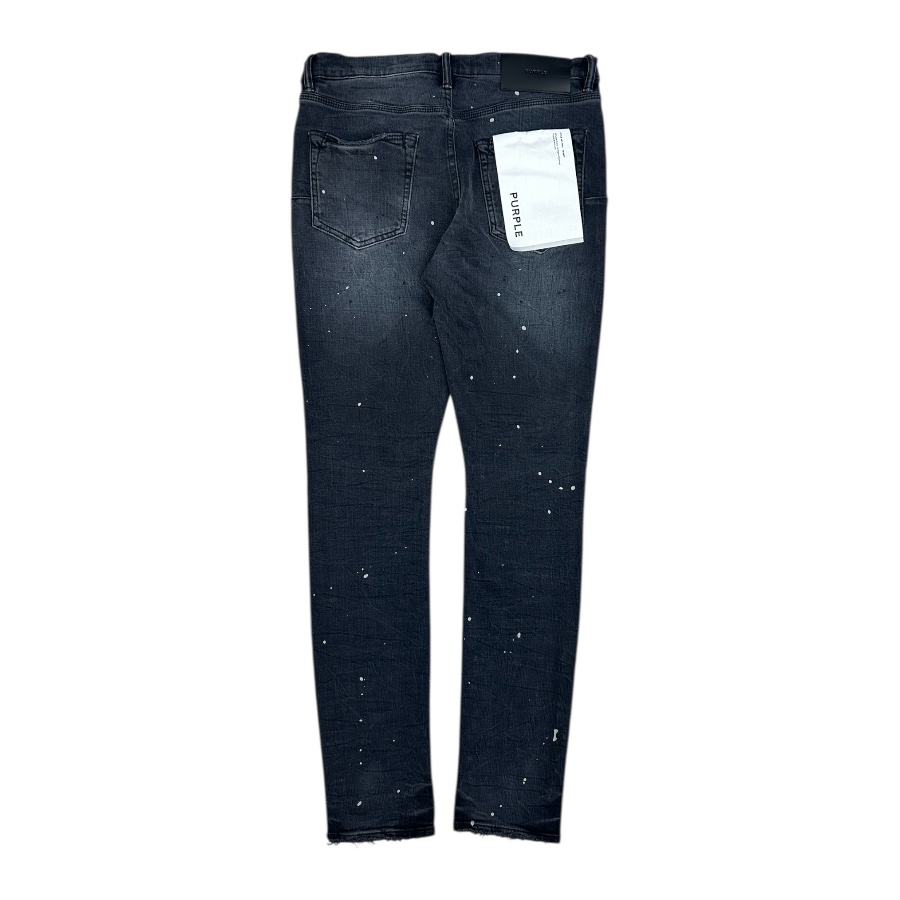 Crafted from premium stretch denim in a black wash, this low rise skinny features abrasions, repairs and reflective paint throughout. This style is distressed with tears at both knees.