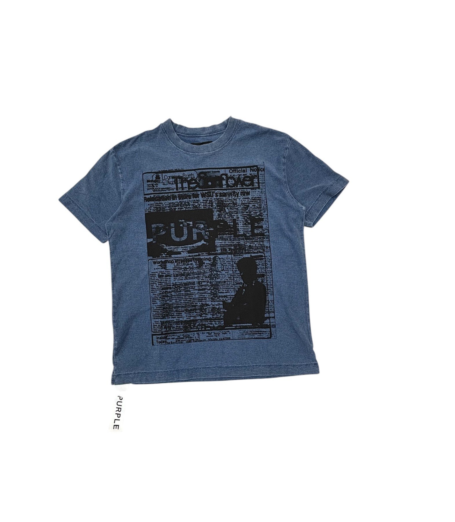 This short-sleeve tee from Purple Brand delivers standout visuals with a bold, newspaper-inspired front graphic layered over a washed blue base. Crafted from soft, midweight cotton, it’s cut for a relaxed fit with a ribbed crewneck and light distressing for a worn-in feel. Finished with Purple’s signature tag detail at the hem, this tee fuses everyday comfort with street-ready style.