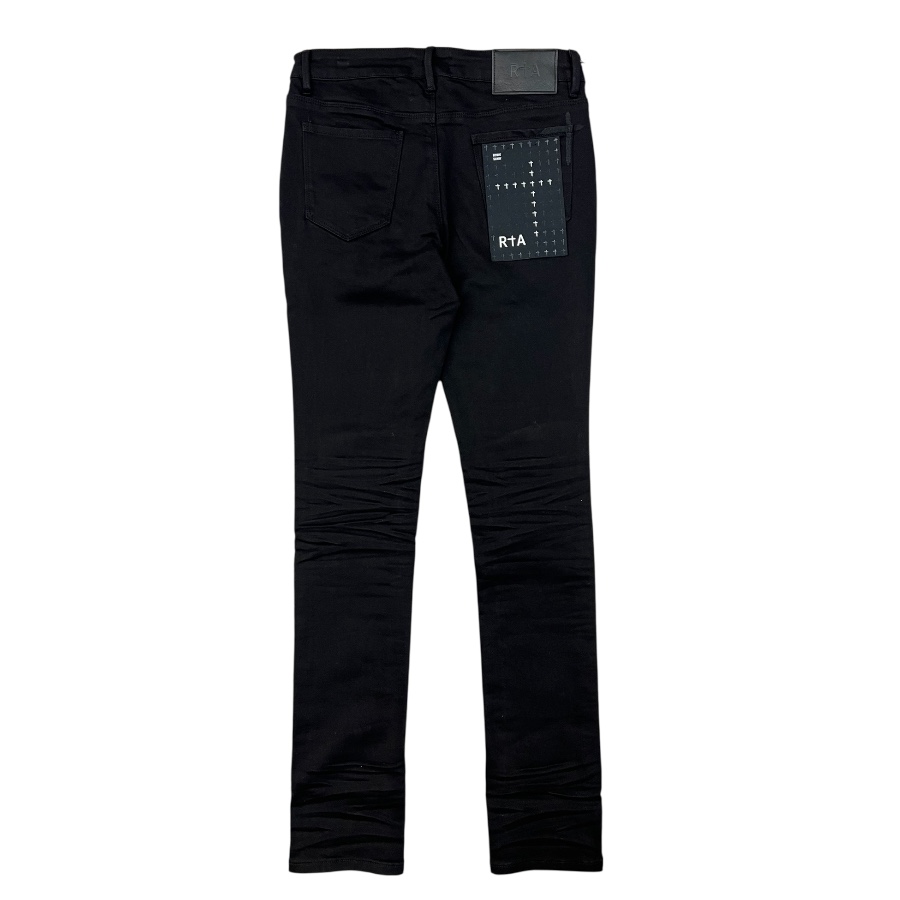The RTA Bryant jeans is a classic skinny fit in black premium Japanese denim with SINNERS detailing on the front and signature RTA crosses down the back legs. This denim style has some stretch, it will be tighter when you first try it on and will relax as you wear in.