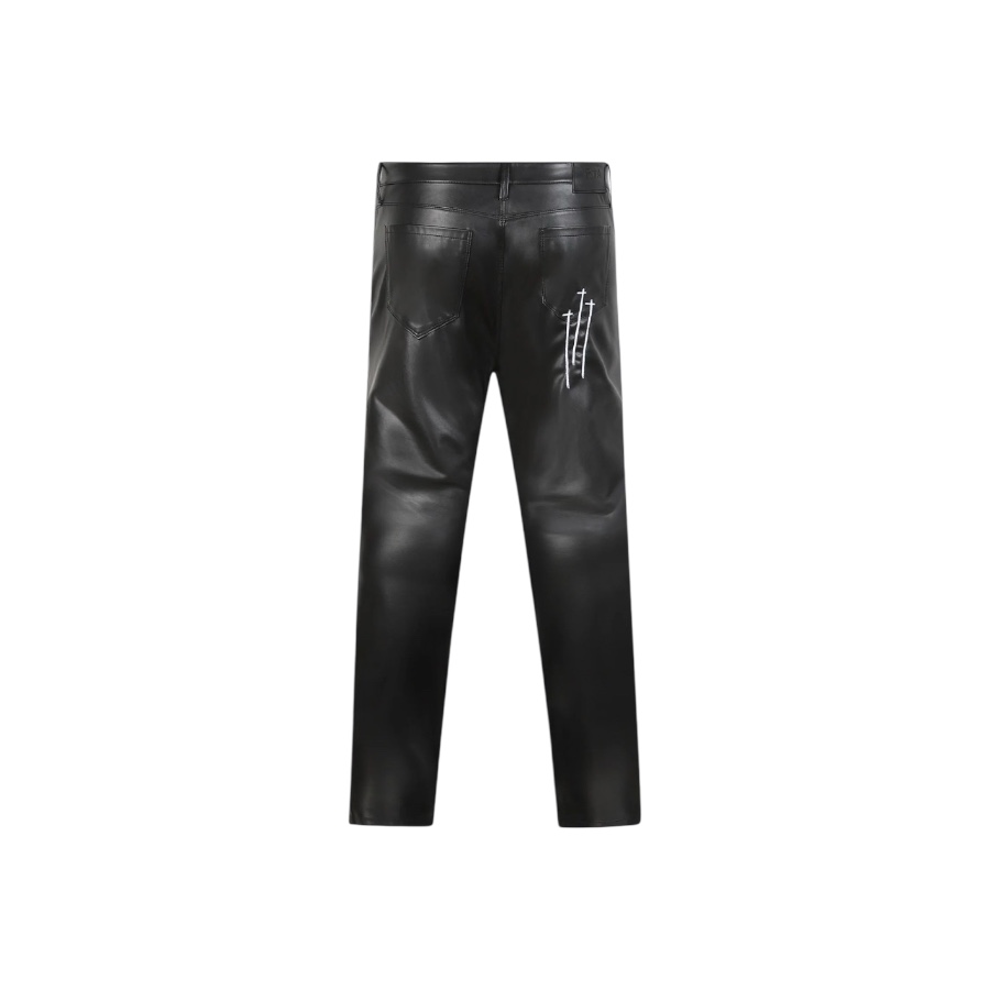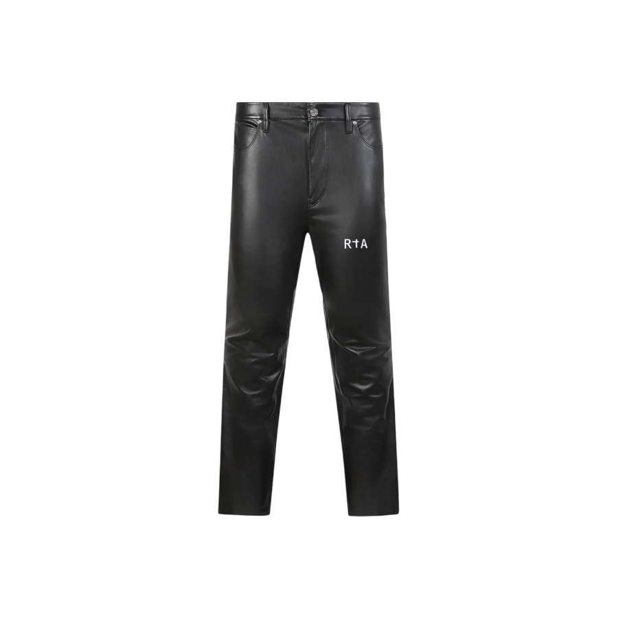 The RTA Bryant Pant is a skinny, eco-leather pant with a white front left thigh RtA logo hit and a white triple cross motif on the back right pocket.