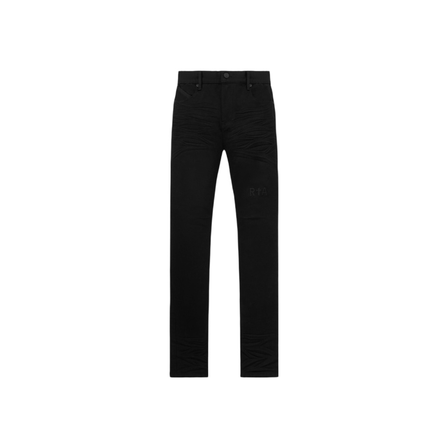 The Bryant Skinny Jean in Black Logo is made from premium denim featuring a tonal embroidered logo detailing at the thigh, belt loops, 5 pocket styling, zip fly, dart design at the knees, and signature leather patch at the back waistband.