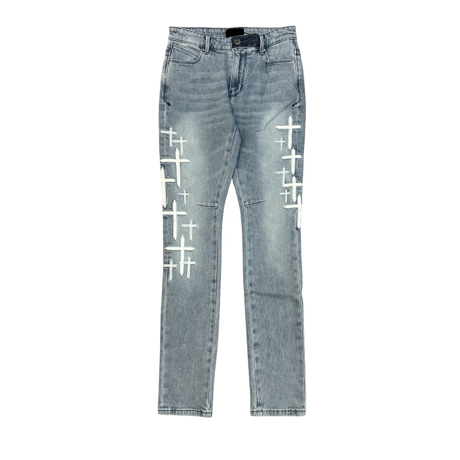 The Bryant Skinny Jean in Coastal Drift Cross Patch is made from premium denim. Designed with a skinny fit and reinforced stitching on the inner thighs. These jeans feature cross patches along the sides, cross rivets on the front pockets, the iconic RtA cross on the back pocket, and signature leather patch on the back waistband.