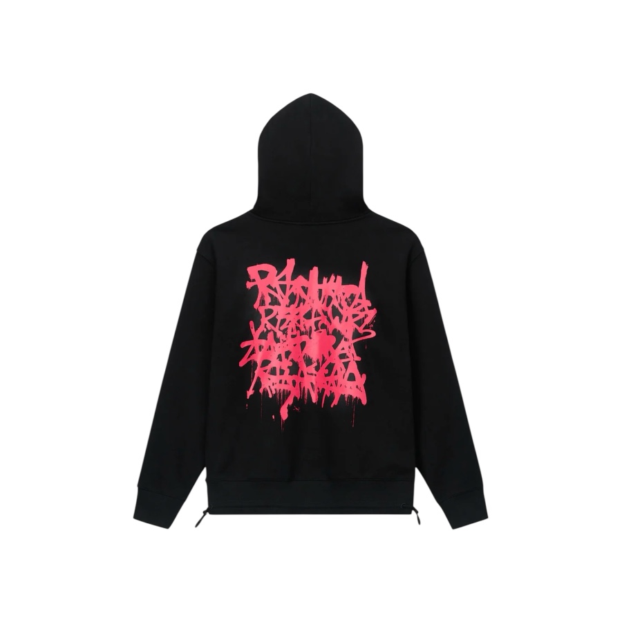 The Jordan Oversized Hoodie in Black Graffiti Pink is made from 100% Cotton. This hoodie is designed with a kangaroo pocket, toggle drawstrings at the waistband and features a front chest logo with paint drip effect and an oversized graffiti back graphic.